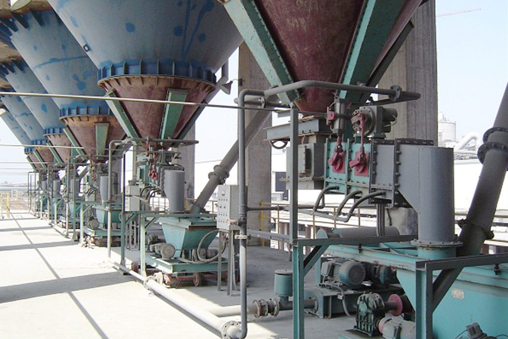 ]]>庫底粉料散裝機(jī)主要由“卸料閘門”、“輸送斜槽”、“彎頭”、“下料接管”、“散裝機(jī)”、“除塵器”、“斜槽風(fēng)機(jī)”等組成。庫內(nèi)部分通過支架吊掛在水泥庫內(nèi)部,以10%的斜度放置,以使水泥料倉內(nèi)的水泥粉呈流態(tài)化(此高壓壓縮空氣由用戶自備羅茨風(fēng)機(jī)或由廠內(nèi)壓縮空氣總管經(jīng)減壓后接入)?!俺隽线B接槽”、“輸送斜槽”在水泥庫外按出料順序連接同樣以10%的斜度放置,正常使用時(shí)打開?!靶读祥l門”用來控制散裝機(jī)裝車時(shí)的水泥落料狀態(tài);“斜槽風(fēng)機(jī)”用來使輸送斜槽內(nèi)水泥物料流態(tài)化。散裝機(jī)為其主體設(shè)備,其下料頭伸縮長度為1.6米,以適應(yīng)不同車型的裝車要求。