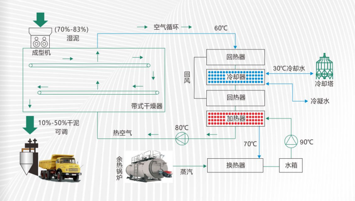 濕泥經(jīng)過(guò)污泥切條機(jī)擠成條狀,加大熱風(fēng)與污泥表面均勻的接觸,污泥掉落到網(wǎng)帶傳送系統(tǒng),熱干空氣從網(wǎng)帶底部送入(送風(fēng)溫度65-85℃),通過(guò)水冷換熱器冷卻塔恒定出風(fēng)溫度,直接對(duì)污泥進(jìn)行干化,與污泥換熱帶出的濕熱空氣,從頂部回到熱泵主機(jī)(回風(fēng)溫度45-55℃),通過(guò)蒸發(fā)器冷卻除濕析出冷凝水排出,變成冷干空氣,經(jīng)冷凝器加熱成熱干空氣回到網(wǎng)帶底部不斷循環(huán),出來(lái)的干泥含水率10-50℃可調(diào)。